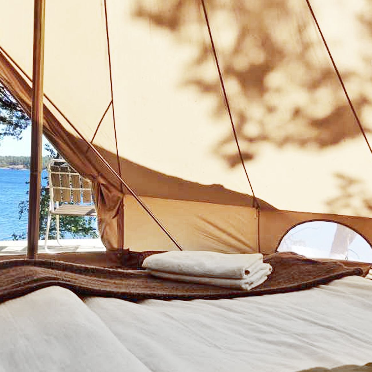 Rymlig glamping tält för 2 till 4 personer. Mysig inredning, egen altan , solstolar, hotell-sängkläder. Tillgång till bastu, dusch, vatten toalett, El och belysning finns i tältet. Aktiviteter: roddbåt, SUP, cykel, vandring, guidning Sälstationens historia.
